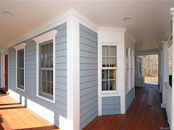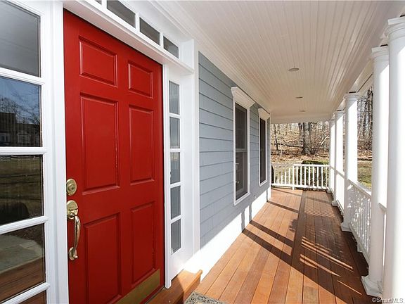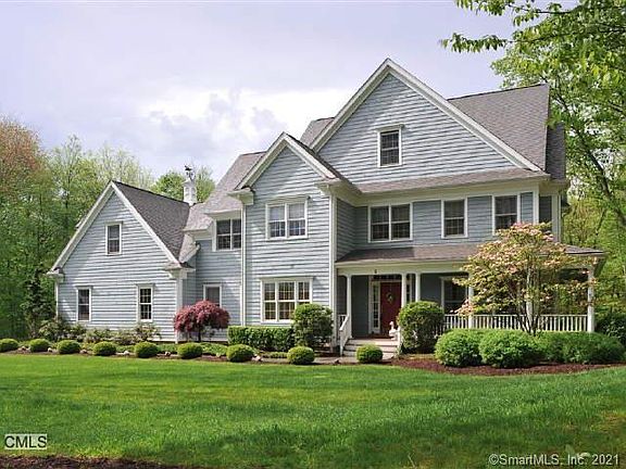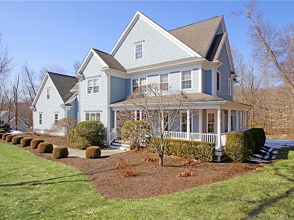 Welcome to this Modern Farmhouse Colonial with a wrap-around front porch in a picturesque neighborhood! Location is excellent! Private yard, gorgeous neighborhood and close to Exit 9. Luxurious home with 9-ft ceilings, 4-inch hardwood floors and beautiful millwork/mouldings throughout. Vaulted ceiling in large sunken family room has built-ins and a floor-to-ceiling fieldstone gas fireplace. Main floor has bright, open concept. Large kitchen w/ cherry cabinets, granite counters, upscale appliances, and an 8 ft long island complete with prep sink and storage on both sides. Pocket doors lead to the butlers pantry w/ wet bar and a huge mudroom with walk-in pantry. Large office on main floor perfect for working from home! Upstairs the expansive master bedroom/bath/walk-in closet offers privacy on one side of the home. There are 4 more bedrooms, two share a Jack and Jill bathroom, and another has its own private ensuite. Pretty wooded views from every room. A large bonus/recreation room sits at the top of the back staircase. Many custom features; stone pillars with lighting at entrance to driveway; intercom system, large turn around Belgian block paved driveway; mahogany deck; walk-up attic with vaulted ceiling could be finished for added living space and more. This idyllic New England home is on an up lot on 3.28 acres and just over an hour drive from NYC. Large yard in back surrounded by wooded area that provides both privacy and natural beauty! Agent is owner of property.
