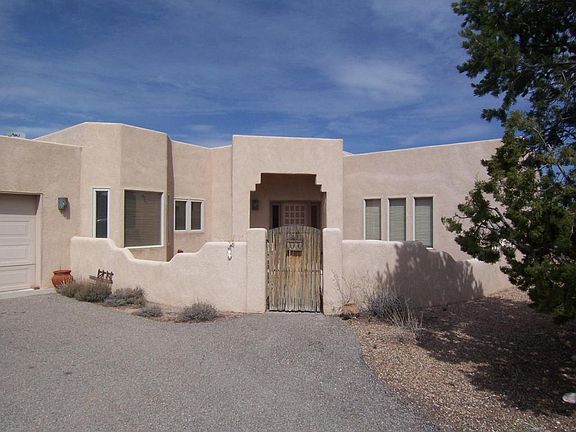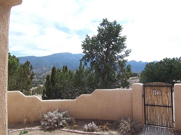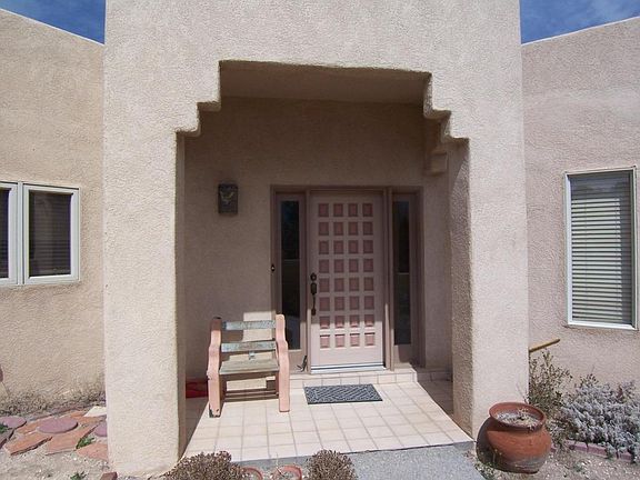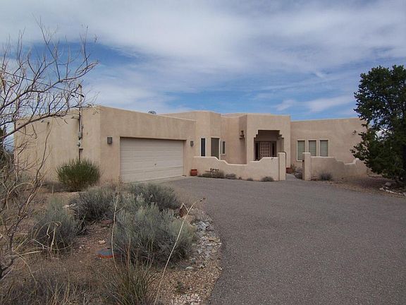 FANTASTIC VIEWS! 5 ACRES! This is THE SPOT to enjoy the sunsets and Cabezon! Wonderful views (and tons of natural light) from all the windows in this well maintained and conveniently located custom home. Just 5 miles from I-25. 2 Bedrooms & 2 full baths (the 2nd living rm could be converted into a 3rd bedroom...) Raised ceilings with exposed beams in living rooms, dining room & kitchen! Sandia Mountain views from bedrooms, kitchen, bkfast nook & front courtyard. All tile floors! 8 skylights! Master bath has large jet tub & separate shower. Huge covered patio on the north side w/ large courtyard! Lots of room to roam on this private 5 acres; plenty room for horses, a studio or guest house... On community water! Great place for your Summer Solstice party with the sun setting behind Cabezon!