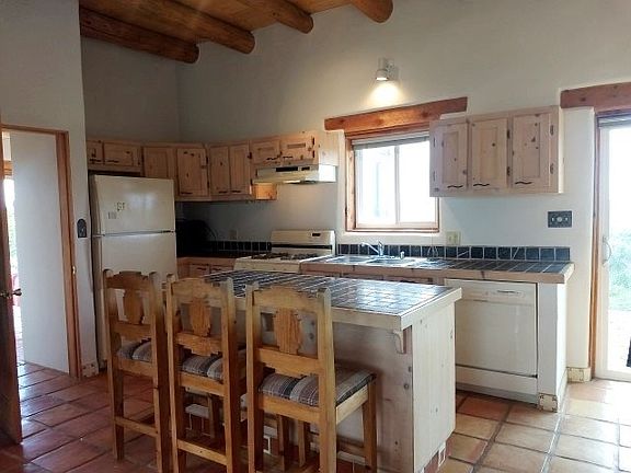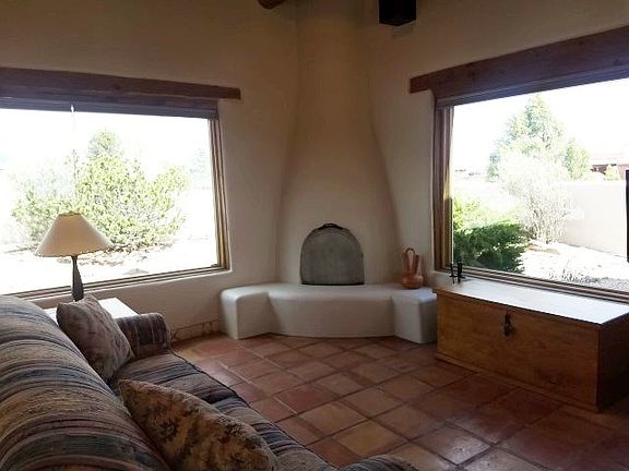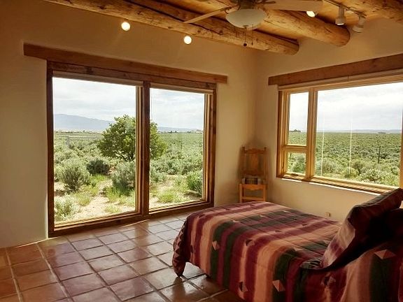 Live in the view! At the end of the road bordered by pueblo land sits this comfortable 2BD/2BA adobe home. Large, Low-e windows maximize the stunning views. Big views of Taos Mountain, of sunset across Pueblo land, and over the twinkling night lights of the town of Taos. Enter through the walled, landscaped courtyard. High ceilings with vigas provide a big, open feel inside. Split bedroom floor plan with open living/kitchen/dining, with saltillo flooring throughout. Cozy up to the southwest-style fireplace while drinking in Taos mountain views. Landscaping is on timed drip-irrigation. Attached 1-car garage. Convenient Northside location provides easy access to town and Taos Ski Valley. Truly a slice of Taos paradise!