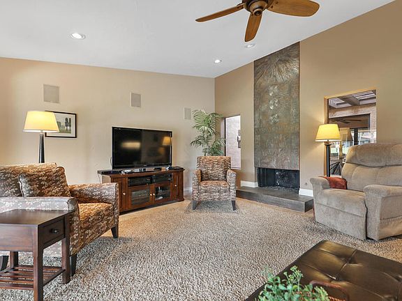 Golf course location with spectacular southwestern mountain views. This immaculate move-in ready condominium home has been beautifully remodeled with updated design features. Offered furnished, including comfort sleeper-sofa in living room. Vaulted ceiling living room creates a spacious feel with fireplace that features an artistic accent wall. A center atrium allows for natural light to pour into surrounding spaces. Tile flooring has been installed throughout main living areas accented with area rugs. Bedrooms have wall-to-wall carpets. The spacious primary bedroom has a large walk-in closet with double hanging and shelving unit. Ensuite bath has a built-in tub surrounded with tiled wall and a glass enclosed tiled shower. Cabinetry with double sinks and full-wall mirror with light sconces. Guest bedroom has a closet that has been divided in half to create a mini-office space. The guest bathroom features a glass enclosed fully tiled shower. The kitchen has been updated with quartz counter tops and back-splash, quality dark wood cabinetry, stainless appliances, and a coved ceiling with recessed lighting. It opens to an adjacent dining space and living area that creates a great-room design. There are ceiling fans in the living room, bedrooms, and rear patio. The washer and dryer are conveniently located in a space between the two bedrooms. An attached 2-car garage has built-in storage space. The A/C unit was replaced approximately one year ago.