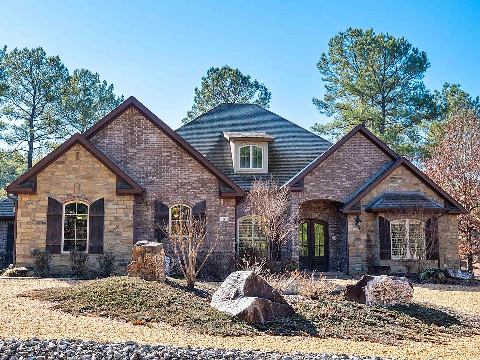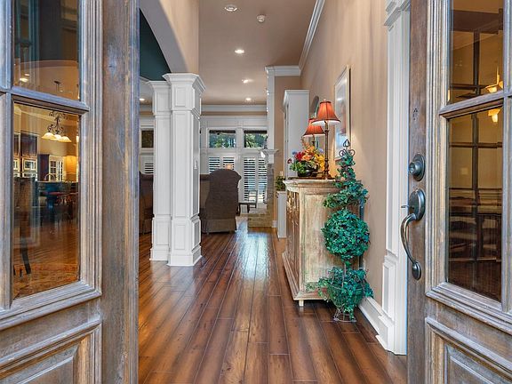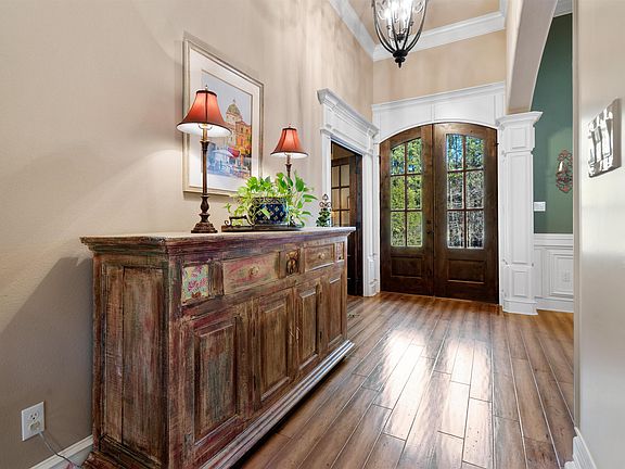 Classic Carriage "Marceau" plan - Elegant French Country. Very open entertaining area with extra high ceilings and double crown molding. Enter through arched wooden doors into entry way with lovely dining room on left anchored by columns and study on the right . Then flow into large great room with floor to ceiling windows including dramatic transoms. Masonry fireplace flanked by tall built ins on each side. Chef's dream kitchen with double ovens, gas cooktop in built in hearth, counter tops and cabinets galore, SS appliances. Breakfast room & great room overlook the course. Primary Bedroom wing includes double closets, beautiful bath with separate double vanities, jetted tub, large walk in shower and water closet. Bedroom features views and sitting area surrounded by windows opening to covered patio all for the enjoyment of nature and golf. Guest wing includes 2 guest suites bathed in light with walk in closets and baths, powder room, laundry room & 3 large storage closets. Studio built upstairs through garage entrance for crafting and art. Full size 3 car garage. Incredible hardwoods throughout with slate tile in the baths. Exquisite old world flair with dramatic touches.