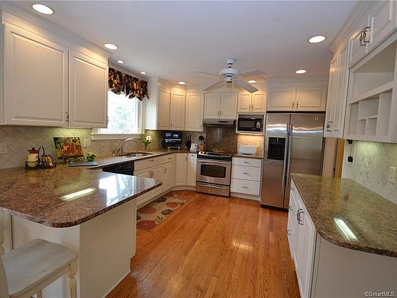 Beautifully Updated raised ranch in convenient East Lyme neighborhood close to schools, shopping and highway. Gracious white kitchen with breakfast bar, granite counters, stainless appliances is welcoming center of home. Hardwood floors throughout generous living room, dining room kitchen and hallway. Deck off kitchen overlooks beautifully landscaped rear yard leading to frontage on Latimer brook. Three ample Bedrooms and full bath complete the main level. Downstairs finds a large family room with masonry fireplace, Laundry room and second full bath. Second Deck off the family room offers shaded space to enjoy the lovely yard and views of brook. There is a workroom off the main hall leading to 1 car garage. The roof, siding and windows have also been recently updated. Nothing to do here but move in and enjoy