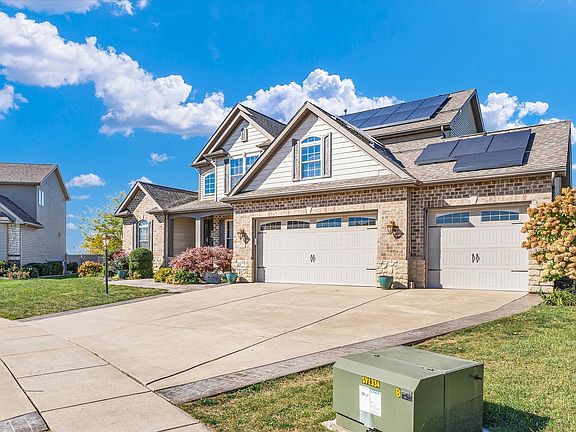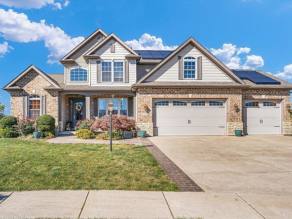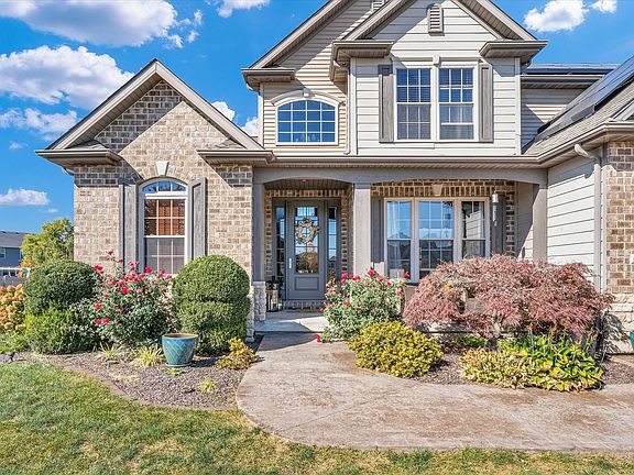 Welcome to this stunning home tucked away on a private cul-de-sac in the Fieldstone subdivision. Step inside a breathtaking two-story family room with a coffered ceiling, gorgeous crown molding, and expansive windows that flood the space with natural light while offering picturesque views of the backyard and pond. The custom kitchen offers granite countertops, a large corner pantry, and a stylish backsplash that perfectly compliments the upscale feel of the home. The primary suite is conveniently located on the main floor and has a thoughtfully designed bathroom and a custom walk-in closet. The three generously sized bedrooms are upstairs, each featuring a walk-in closet and an en-suite bath. The partially finished basement has everything you need for entertainment, including a theater area, wet bar, fifth bedroom, full bath, and plenty of extra space for storage or future projects. Unwind under the pergola on the backyard patio while taking in the peaceful water views. The heated three-car garage adds even more functionality to the home. Recent updates include new refrigerators (2022), a microwave (2023), a dishwasher (2023), fresh main floor paint (Spring 2024), a new kitchen backsplash (Spring 2024), an extended patio (Spring 2023), a new sump pump and backup (2020), new carpet (2022), a garage door opener (2023), and more. Additional features include a high-end projector and screen, updated light fixtures, ceiling fans, basement storage cabinets, fiber internet (2024), solar panels (2024), remote-controlled blinds, and wiring for a hot tub on the back patio. This former showcase home is packed with upgrades-don't miss your chance to make it yours!