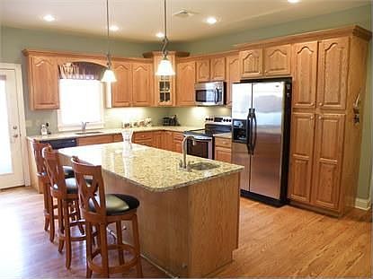This sparkling, young, three bedroom ranch home with 2 baths, and an enormous full basement and two car garage, also has a small lakefront lot with dock and boat rack across the street! The rocking chair porch overlooking the lake, and the deck overlooking the private fenced yard and pond, make this home a treasure both inside and out! The open floor plan invites entertaining, and the raised hearth stone fireplace acts as a hub of this amazing home! The center island, oak and granite kitchen, lots of hardwood, plus the first floor laundry room and step in tub, are only a few of the special extras that come with this Cedar Lake gem! This is the single level living everyone is looking for!