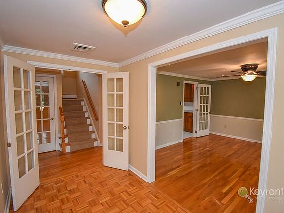 This spacious Doylestown home offers a thoughtful layout with modern updates and an inviting outdoor space. Just inside the front entrance, you'll find a comfortable living room with a wood-burning fireplace, divided by French doors to create flexible spaces for lounging, reading, or working. Opposite is a formal dining room that leads into a galley-style kitchen featuring stainless steel appliances and a bright eat-in nook. A rear door opens to a large 30' x 18' cedar deck with a retractable awning. Perfect for relaxing or outdoor entertaining. The mudroom, accessible from the garage or a side entrance, offers practical convenience with a washer/dryer and utility sink. A convenient powder room is also located on this level. Upstairs, you will find all four bedrooms. The primary suite features a walk-in closet and a private bath with a glass-enclosed tile shower. Three additional bedrooms share a full hall bath with a tub/shower, and each bedroom includes a ceiling fan for added comfort. The partially finished basement provides an additional 250 square feet of living space, ideal for a rec room or flex space. The unfinished portion includes ample storage and a built-in workbench for hobby projects. Outside, the home is surrounded by beautifully landscaped grounds, with mature trees, garden statues, and a mix of sun and shade that create a peaceful, park-like setting. Tenant is responsible for electricity, gas, sewer, trash, internet, and lawn/snow/ice Dogs are allowed for an additional fee. Some breed restrictions apply. This home is enrolled in an HVAC filter delivery program for $10/mo
