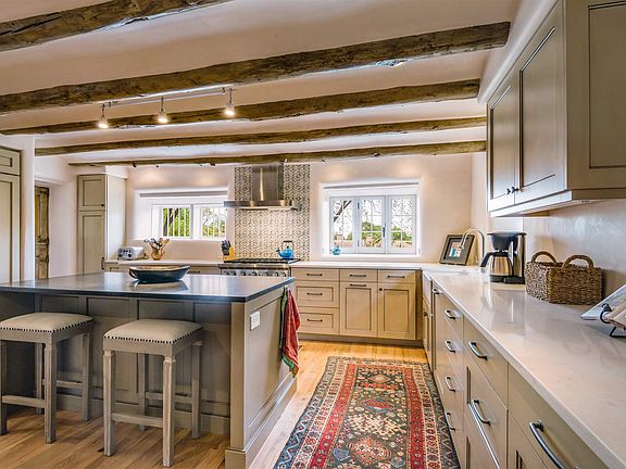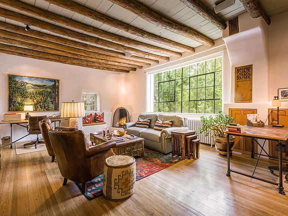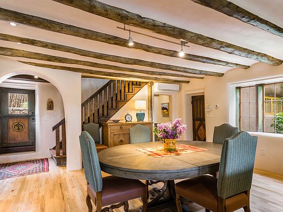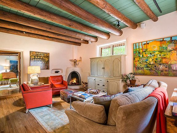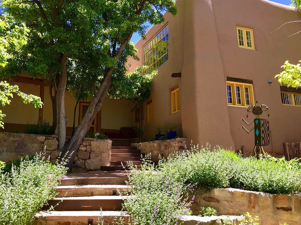 The Sheldon Parsons House and Studio - In a prime Eastside location, just 2 blocks from Canyon Road, history, art, character and colorful gardens blend with modern amenities in this adobe home, garage and attached casita. Renovated in the 1920's in the Pueblo Revival style by the artist, Sheldon Parsons, his hand-painted Southwest inspired designs appear on doors and windows. Current owners have sensitively updated and renovated creating a new chef's kitchen with dining area and adding bathrooms, radiant heat and air cooling. The artist's studio with a large warehouse window is now a magnificent Great Room. The 4 fireplaces are handmade and sculptural in design keeping with the artistic character of the home. Vigas and beams are present throughout. Almost all the flooring is hard wood. The attached casita has a living room, kitchen, bath and bedroom. A long front portal covered in wisteria offers an elevated view over the gardens. This special property oozes character and style yet offers the amenities and comforts of today.