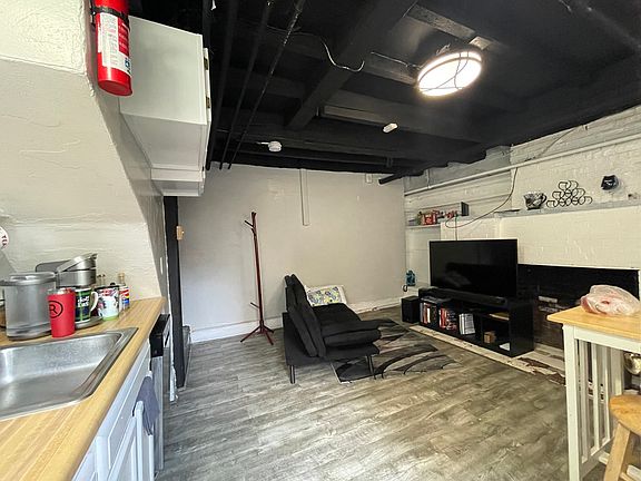 Hardwood floors throughout, open kitchen with dishwasher, exposed brick, decorative fireplace.