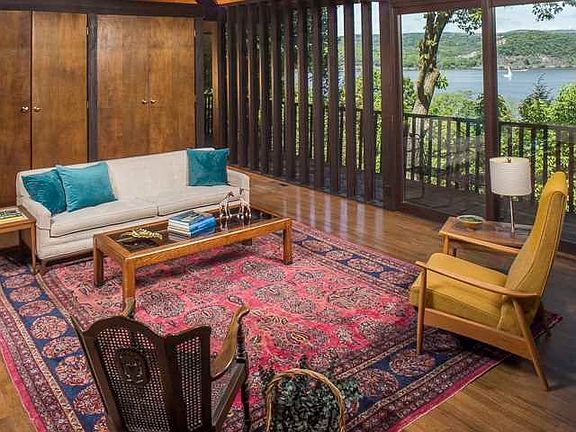 Romantic mid century home; architect designed to follow the river view at top of ridge overlooking Hudson River. Peaceful, natural wooded ten acre estate. Three cedar sided structures (main house, 3 car garage, guest house) linked by riverview board walk. Musician inspired for residential-performance use. Dramatic soaring ceilinged living room, large dining room, kitchen are bordered by sliding glass doors linking the interior and exterior environments, Four bedrooms, baths, central family room, on above ground lower level reflect the floor above with outdoor access to the river views. Elegant craftsmanship is evident in the finished wood ceilings and full house hardwood floors.The two bedroom guest house complements the main house design with vaulted, wood paneled ceiling living room opening to expansive deck overlooking lower grassy outdoor entertainment yard with full river views. The oversize three car garage is finished with wood paneled loft.the Through deep woods a private road opens to an environment of exquisite natural beauty and perfectly complementary living. Down hill is the charming hamlet of New Hamburg with Metro North access to Westchester and New York City. CO in place although assessment/taxes will be adjusted after sale. ( House is under electronic surveillance to be deactivated for appointments.)