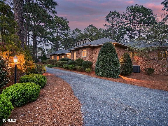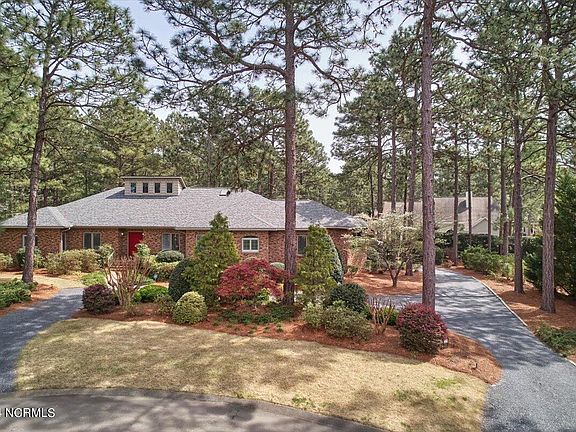Classic, gracious living with a contemporary flair! Welcome to 5 Chatham Lane, where everything wonderful about Pinehurst comes full circle. This 4 bedroom, 3 bath home is situated on a park-like, private DOUBLE lot with mature dogwoods, towering pines and manicured grounds. A private well serves the irrigation system. This home is all brick construction. The open kitchen/family area has a walk-in pantry, plentiful cabinets, 2 islands, double ovens, and all new stainless steel appliances. Fresh paint throughout the home, makes it move-in ready. Spotlessly clean! Enjoy the breezy, covered back patio, a circular driveway for guests, and a back entry drive for the owners. The front door is 5' wide! There is a buried propane tank for the fireplace. This one has ALL. THE. THINGS! The library or sitting room boasts clear story windows to bring in natural light, and a soaring ceiling. Many skylights bring natural light into the home. The roof is brand new in 2023. The Pella windows and sliding doors are sleek and work beautifully. They also have interior ''stay clean'' blinds!! Formal dining or office space too and updated wood-look flooring in all living areas.