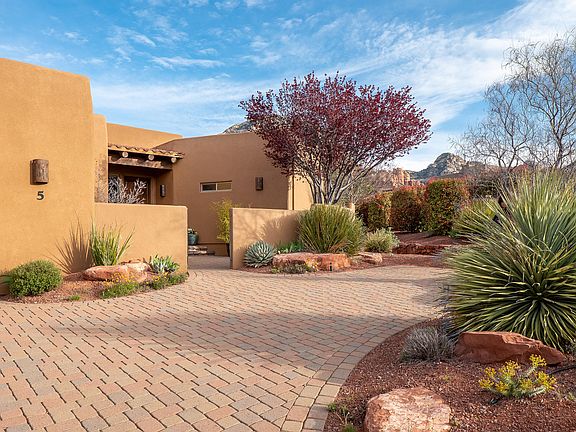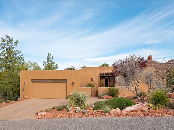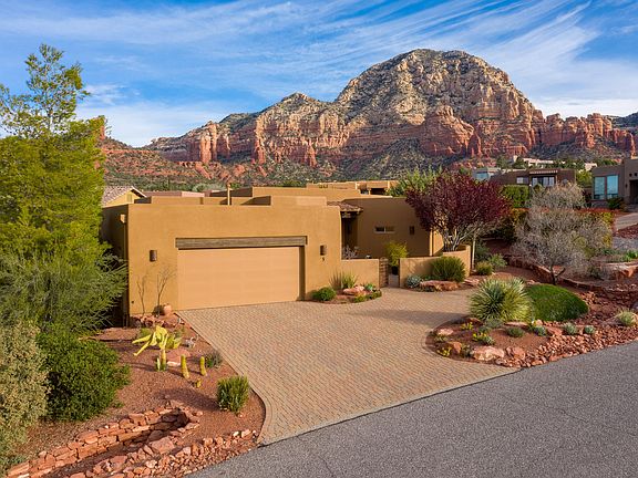Enjoy the Perfect Sedona Red Rock Getaway or permanent home in this southwest style custom masterpiece. Designed for entertaining, the open floor plan boasts 2551 sq ft with 3 separate outdoor spaces, 10' ceilings, all tile floors, stacked stone fireplaces in great room & first master. Privacy of 3 bedrooms separated from each other, the 2 master suites each with double doors & exits to the fabulous walled backyard. The well designed kitchen includes beautiful granite, breakfast bar, island, butler pantry & GE Monogram Appliances. The living room wall of glass offers breathtaking Red Rock views. An amazing location with spectacular views in sought-after Crimson View, walk to trailheads, restaurants & shops. Plenty of storage under the house too! Inside & out, Sedona at its best!