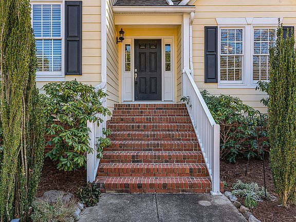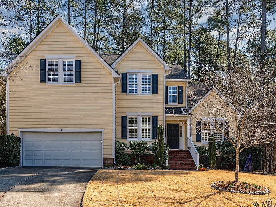 Wonderful setting on a cul-de-sac with private, wooded area in back. Open interior features a living room with a vaulted ceiling, hardwood flooring and a gas fireplace. Separate dining room. Spacious cook's kitchen has double ovens, gas cooktop, pantry, solid-surface counter tops, tile flooring, breakfast area with glass doors to the screened porch. Main-floor study/office, with built-ins, can be closed off with French doors. Main-level primary suite with vaulted ceiling, walk-in closet, hardwood flooring, and spacious bath with double sinks, soaking tub, walk-in shower. Upstairs there are three additional bedrooms with great closet space and a full bath. Laundry room with built-ins and a powder room on main level. Plantation shutters. Many closets plus attic storage. Two-car garage. Professionally landscaped with a stone patio, zoysia grass front lawn, perennial beds, Japanese Maple, Birch tree, Japanese Cherry Blossom, Crepe Myrtle, limelight hydrangeas, azaleas, gardenia, irrigation and drip system; the yard is flowering three out of four seasons. Natural wooded area in back. Gently-lived in, one-owner home has been well maintained and updated. Great location with easy access to Southpoint shopping area, I-40, RDU Airport, Duke, and UNC.