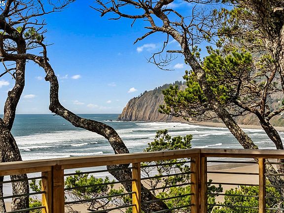 Perched above the shoreline with panoramic views of the ocean, beach, and Neahkahnie Mountain, this architecturally designed home offers both privacy and connection to the coastal landscape. Immediately feel serenity in the open space and scenery. The layout brings the outdoors in, with the living, dining, kitchen, and primary bedroom all oriented toward the view. Literally, wake up in bed to the sight of waves rolling along, grab a coffee and step onto the roomy deck immersing yourself in the sights, sounds, and uplifting energy of the ocean. On the opposite side of the home, a separate den/tv room provides a cozy space with its own magical view of the trees. Downstairs, two private bedrooms, a bathroom, and a spacious laundry room add comfort and functionality. Quality craftsmanship and high-end finishes throughout ensure lasting appeal. See features sheet for details and more amenities.