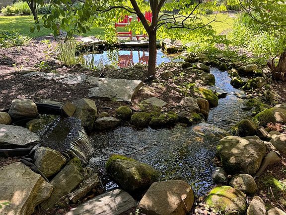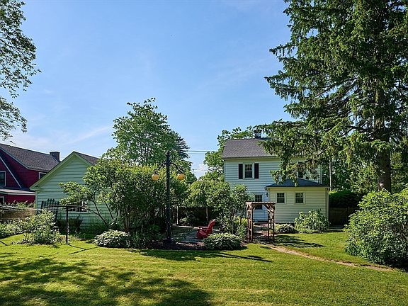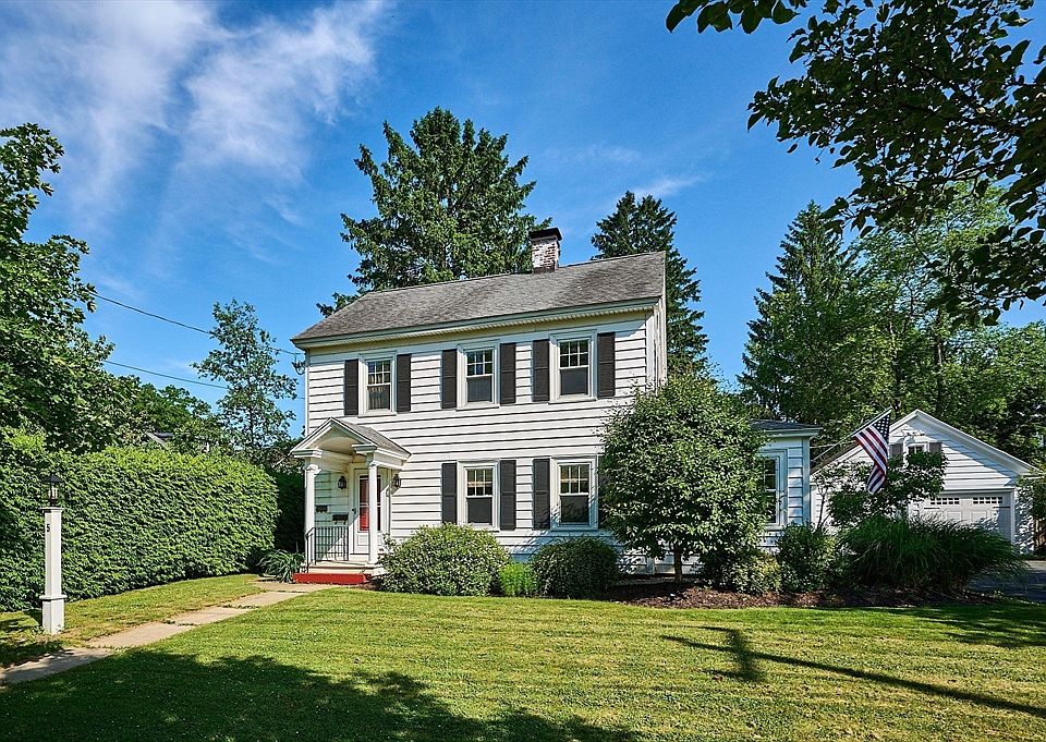 This meticulously maintained home is full of charming details, featuring beautiful wood floors and attractive woodwork. The picturesque backyard offers a stone patio, garden area, and a professionally designed unique water feature that creates a peaceful, tranquil setting with the soothing sounds of moving water. As you step inside, you'll be greeted by a warm and inviting interior showcasing numerous updates. The wonderful kitchen has attractive cabinetry and granite countertops and is open to the dining area. The spacious living room features a handsome fireplace and french doors leading to a sunlit sitting area surrounded by windows. The first floor includes a beautiful tiled bathroom, while the second floor offers three bedrooms and a very nice full bathroom. The finished attic is a bonus, beautifully done with wood floors, making it a perfect office or studio. Additionally, this home includes a full basement, central air conditioning, and a detached two-car garage with storage.