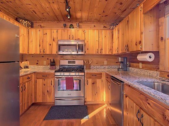 Majestic layered mountain views from every level! Cabin is easy access, less than 5 paved miles to down town Blue Ridge. Great parking. Owner has recently installed granite, fresh painting / staining and installed new landscaping. Move in ready. Being offered partially furnished. This cabin is why people escape to the mountains - year round layered views with the perfect layout for families or a vacation rental. A full bathroom and bedroom on every level, so everyone has their own space. Come see for yourself, before she escapes!
