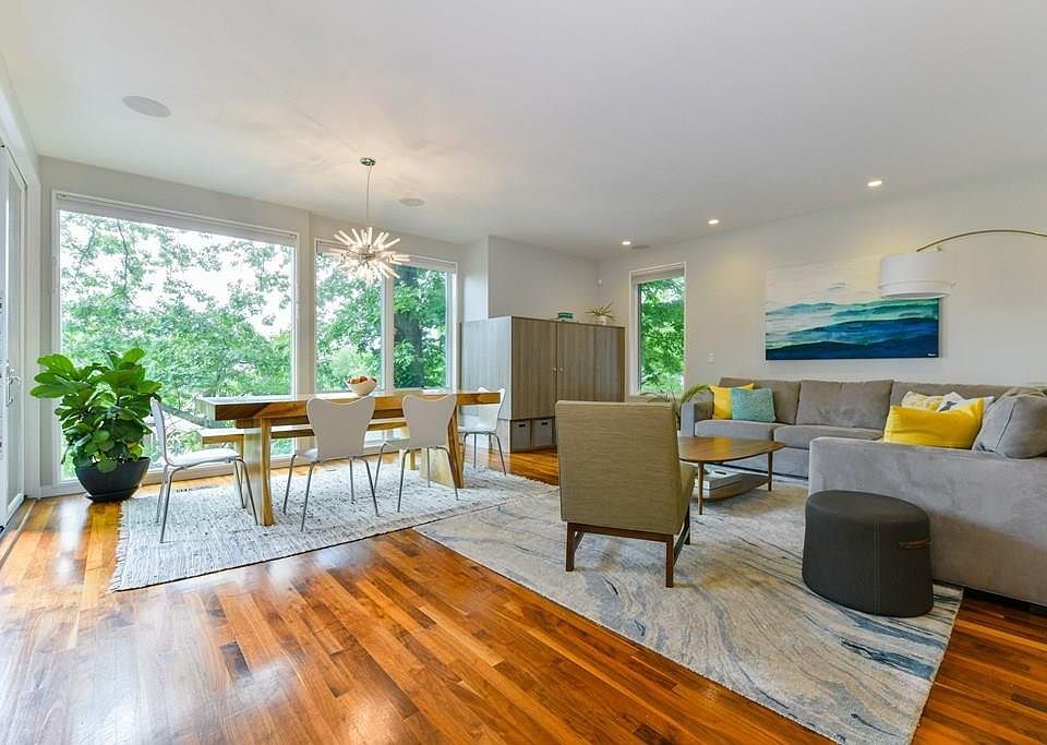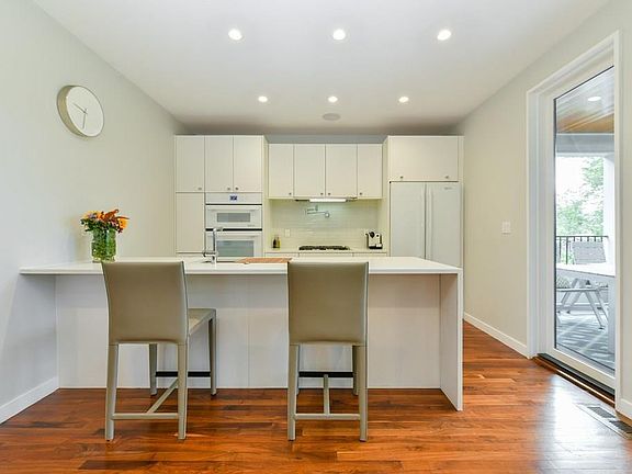 Renowned Mangiacotti Development masterpiece in central JP. Modern & minimalist inspired 2nd fl: 3 bed, 2 bath engages with floor to ceiling windows, unobstructed views overlooking lush & mature trees & Southwest corridor park. Covered outside deck offers opportunity to engage nature as an extension of living space. Striking open layout anchored by stunning modern kitchen with expansive quartz center island + Kohler "stages" sink, pot filler, white "floating glass" series Jenn-Air appliances. Spacious owner's suite offers private deck, walk in dressing area/ closet, spa-like bath with floating vanity, radiant-heated flooring + large shower. 2 car private / heated garage with electric car pre-wiring. 272 sqft finished & climate controlled bonus room (off garage) perfect for home office, or gym. Designer finishes include walnut flooring, custom closets, European cabinetry & built-ins, audio system. Exceptional attention to every detail. Assoc enclosed dog run + meditation garden.