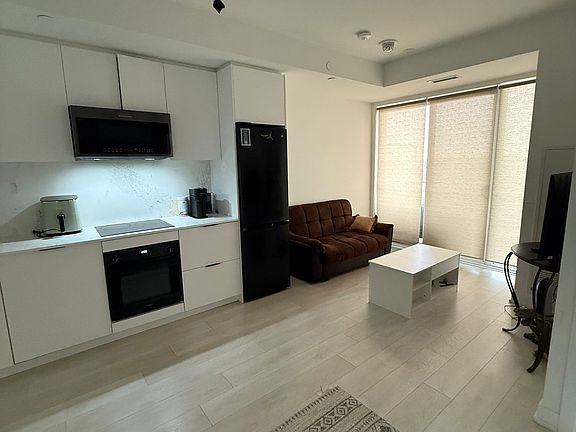 Experience modern elegance in this stunning 1-bedroom, 1-bathroom suite offering 520 sq. ft. of total living space (470 sq. ft. interior + 50 sq. ft. balcony). Thoughtfully designed with 9-foot ceilings, an open-concept layout, and floor-to-ceiling windows, a balcony with breathtaking views of the city skyline and the Don River. The modern kitchen features premium cabinetry, quartz countertops and backsplash, and integrated stainless steel appliances-perfect for both everyday living and entertaining. Enjoy world-class amenities including a rooftop terrace with pool and cabanas, outdoor dining areas, a firepit, a sports lounge with a wet bar, and a fitness centre with cardio, weights, aerobics, and boxing zones, plus guest suites, a 24-hour concierge, and more. Ideally located steps from green spaces, conservation trails, and bike paths, and moments from restaurants, cafes, and cultural destinations. Only an 8-minute walk to the Eaton Centre and a 2-minute walk to Sumac Subway Station, and close to some of Toronto's finest universities, hospitals, and cultural centres. Internet included. Book your private showing today and experience the best of luxury living.
