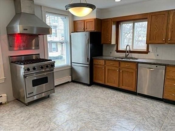 Beautiful 2nd floor apartment with 3 bedrooms and 2 full bathrooms. All hardwood floors, high ceiling, large kitchen, w/gas cooking and good size dining area. Kitchen is fully equipped with refrigerator, dishwasher and stove. Newer kitchen cabinets, recessed lights and ceramic backsplash. New tile flooring. All the 3 bedrooms are very good size with hardwood floors. Master bedroom with master bath. Both bathrooms were recently updated. The whole apartment was freshly painted and professionally cleaned.The landlord will provide washer and dryer H/UP in the basement. Plenty of parking-on the street. This apartment is located on the side street and very close to Roslindale Square and short distance to Forest Hills Orange line, Roslindale Square Commuter Rail, Longwood Medical Area and Downtown Boston.