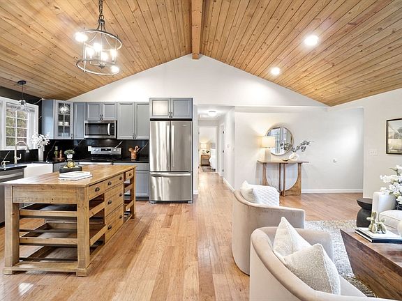 Welcome home to this beautiful updated 3 bedroom, 2 bath ranch with open floor plan and cathedral ceilings. Enjoy an amazing kitchen with a large farm house island, Quartz counters, stainless steel appliance and extra storage making entertaining a breeze. Directly off the kitchen you have 3 bedrooms, one currently being used as a walk in closet and a large bathroom with double vanities and a glass shower. There is a sunroom that could be easily finished for additional living space. The basement has been finished to include oversized open space and full bath. The backyard deck and patio create an awesome outdoor oasis. There is updated 200 amp electrical, hardwood flooring throughout the main level, recently replaced windows, roof and air condition and so much more.