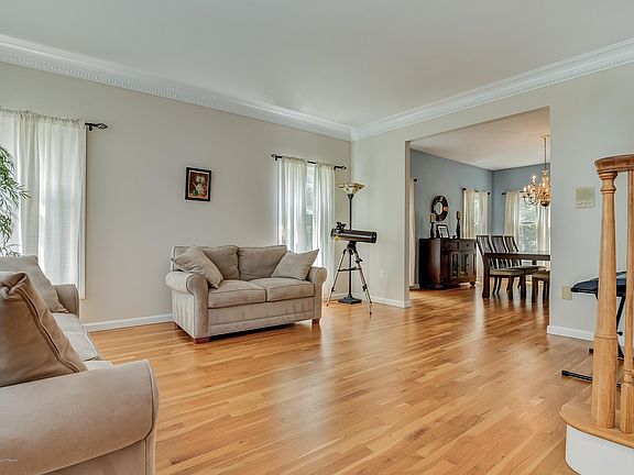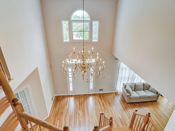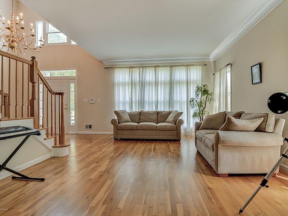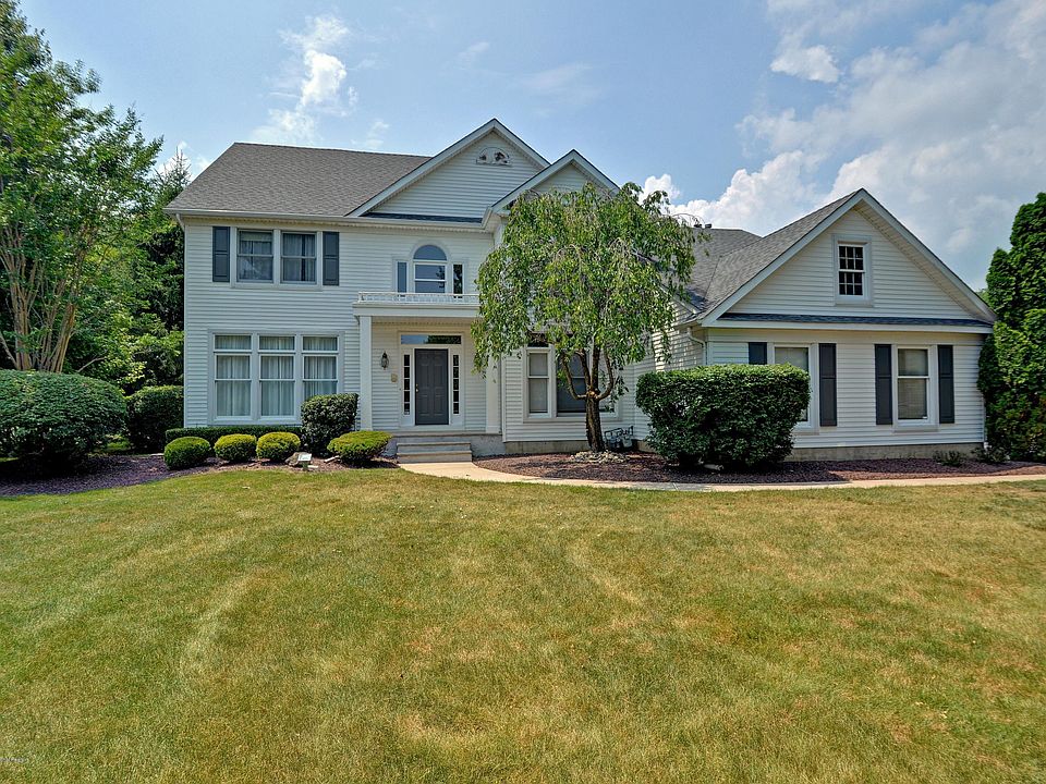 Inviting center hall colonial on an oversized corner lot with impressive curb appeal. Soaring ceilings and tons of natural light throughout make this a truly special home. Two story central entry foyer is open to living room and dining room, all with hardwood floors. French doors from the foyer lead to the first floor home office. Newer eat-in kitchen has cherry wood cabinets with tile backsplash, center island with seating for four, very generous dinette area, stainless appliances, granite counter tops, and hardwood floors. Kitchen also has glass slider to the oversized wood deck and a large open pass-through to the family room. The breathtaking family room has a gas fireplace with beautiful colonial and marble surround, vaulted ceilings, French door to the deck, and a back staircase