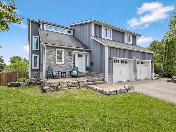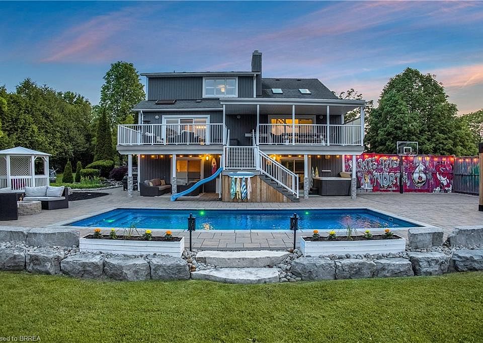 Welcome to your private paradise—a stunning custom-built modern farmhouse style home, nestled on a fully fenced half-acre corner lot with no rear neighbours, in the peaceful village of New Dundee. Thoughtfully designed and professionally landscaped, this home offers a luxurious yet family-friendly lifestyle surrounded by nature. Step into resort-style living with an in-ground fibreglass saltwater pool (heated), a saltwater hot tub, and a tranquil pond with a waterfall. Entertain or unwind on the waterproofed composite deck, offering durability and year-round enjoyment. For active lifestyles, enjoy a basketball court adorned with vibrant graffiti murals, a playground area, and expansive green space. This backyard is as functional as it is picturesque—perfect for both quiet mornings and lively gatherings. Inside, the home offers 3+1 spacious, renovated bedrooms. The heart of the home is the Great Room, featuring soaring ceilings and a double-sided gas fireplace shared with the dining area—ideal for cozy evenings or formal entertaining. The maple kitchen is handcrafted with granite countertops and hardwood floors run throughout the main level. The double walkout basement features an open entertaining space with a hockey playroom and custom-built sauna. The flexible lower level is also ideal for in-laws, guests, or a home office. Further additions included are a high-efficiency gas furnace (2023) Central A/C and water softener (2014) and eco-friendly low-flush toilets. This rare opportunity offers the perfect blend of quiet country living, timeless modern farmhouse design, and modern upgrades—all just minutes from the city. Whether you're seeking a family retreat, an entertainer's dream, or a tranquil escape, this exceptional home delivers. Don't miss your chance to make this one-of-a-kind property your forever home.