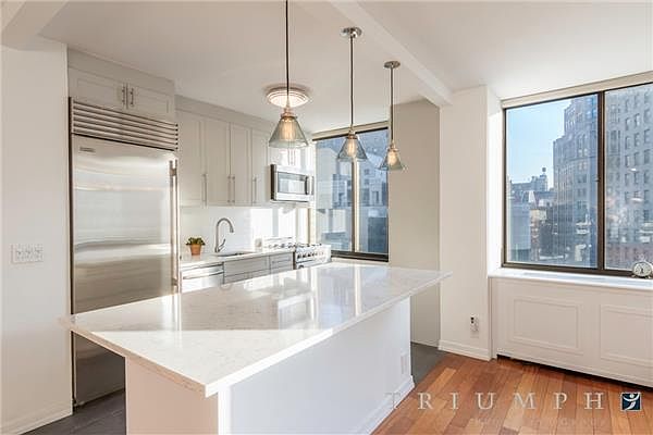 Surrounded by windows this renovated, open, corner unit with desirable split bedroom layout is spacious and bright. The apartment faces South and West and has over sized windows offering a generous amount of light through out the day and vibrant Flatiron and city views. The balcony, accessible from the living room offers all this plus open views North. The kitchen underwent complete renovation and includes a full compliment of high end appliances including: Sub Zero, Bertazzoni and Bosch. There are beautiful white veined Quartz counters and a large breakfast bar with seating for four in addition to all new cabinetry, pantry and a dining alcove. The master bedroom features an en-suite bath and there is a second bedroom and full second bath room as well. Amenities include: fully-equipped GYM with WiFi, children's playroom, Madison Club resident's lounge with WiFi, storage lockers, bicycle storage, garage, a generator and all services including Valet. Madison Green is located at the south side of Madison Square Park and next door to the iconic Flatiron Building. The area is rich in history and a treasure trove of amazing architecture. You are in the heart of the historic Ladies' Mile. Fifth Avenue shopping, Eataly, Trader Joe's, Fairway, Whole Foods and Union Square Farmers' Market are within a few short blocks. Public transportation and many of the best restaurants are nearby. Pets are welcome!