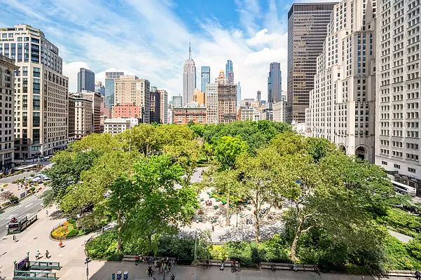 Perched right above the treetops of Madison Square Park, with the Empire State Building poking you in the nose is a gorgeously renovated 2 bedroom 2 bathroom home in the much sought after Madison Green Condominium. Every room is flooded with natural light and spectacular views including the clock tower, this home has been meticulously updated. Every aspect of this luxurious gem was carefully chosen, from the refined finishes and hardwood floors to the thoughtful high-end systems. Fabulous open floor plan perfect as a living and entertaining space is seamlessly served by a custom kitchen styled with custom cabinetry, integrated lighting, and an island with matching granite countertops. The top-of-the-line of appliances is tailored to the chef, with a Sub-Zero refrigerator, Wolf oven, Viking microwave, and Miele Quiet dishwasher. Both bedrooms invite comfort and feature ample closets that are fully-outfitted. The second bedroom has a large sliding wall that opens to the living room. This can be used as a second bedroom, den, office or additional space for the living room. The primary bedroom has two closets, one of which is a walk in but both are fully outfitted, and an elegant en-suite bathroom with marble floors and glass tiling throughout as well as a frosted glass wall and door entering into the bathroom. The second full bathroom was richly appointed with floor-to-ceiling marble tile, and both bathrooms have floating vanities. The master bath is graced by a frameless glass rainfall shower and the second bath, a soaking tub for a spa-like experience. The over-height translucent doors are solid wood which complete the contemporary look. If you work from home, the owners thought of that too. A built in desk with a nook for an at-home office right off the kitchen. The apartment in each room is completed with custom cabinetry with granite countertops over the AC units that includes built-in storage, as well as citiquiet windows to make it as serene as can be. Closets galore including a walk in coat closet. Madison Green is a full-service condominium located in Flatiron. It includes a newly renovated lobby, a courtyard with seating and tables, full-time doormen, porter and concierge, dry-cleaning, laundry on each floor, a gym, children's playroom, an entertainment lounge and garage. Also, centrally located to many forms of transportation including the N, R, W, F, M, and 6 trains.