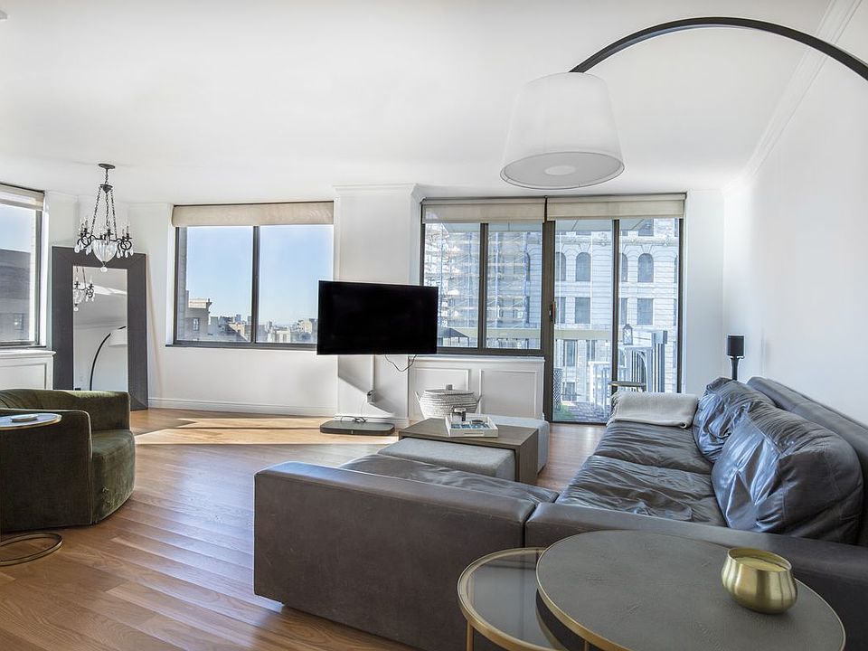 Immaculate, sun-flooded corner 23rd floor 2 BR, 2 bath home with dining alcove, 6X9 balcony, open city skyline views from oversized windows and south and west exposure. Meticulous renovation includes large windowed kitchen with cherry cabinetry, stainless appliances, a 36" double-door fridge and granite countertops. Two pristine bathrooms, one with tub and one with shower. Warm finishes include new wood strip flooring, new solid core doors and crown mouldings . Luxury F/S building, centrally located on prime Flatiron block, steps from Madison Square Park, Shake Shack, Eataly, Union Square farmer's market and Fifth Avenue shopping. Amenities include 24-hour drmn, concierge, resident super, 24-hour complimentary fitness center, garden, garage, children's play room, laundry room on every floor, Madison Club resident lounge with wifi, and Chase ATM in the lobby. Available 1/31/20. Sorry but dogs are not allowed to renters in this building. I am a resident broker.