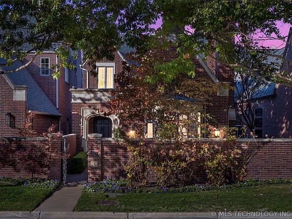 The Tudors, upscale living near downtown, Gathering Place, River Parks Cherry Street and Utica Square. High ceilings throughout, vaulted, beamed living/dining. Open floorpan. Large 1st floor primary suite with 2 full bathrooms and walk-in closets, adjoining office/study. Two upstairs bedrooms w/private baths. Large Game Room upstairs with downtown views, large closets. Exterior courtyard patio wt gas log fireplace. Gated access.