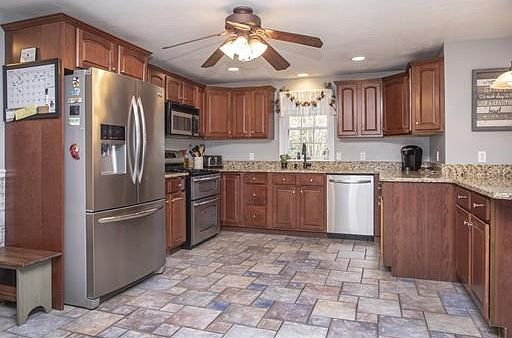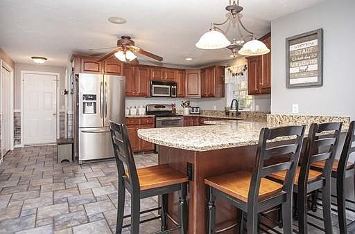 - Kit Dscrp: Main Level, Dining Area, Ceiling Fan(s), Countertops - Stone/Granite/Solid, Deck - Exterior, Flooring - Stone/Ceramic Tile, Stainless Steel Appliances, Closet, Open Floor Plan, Recessed Lighting, Exterior Access, Country Kitchen, Peninsula