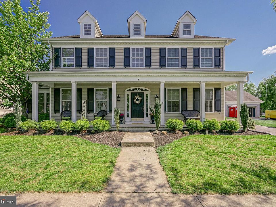 BACK TO ACTIVE showings start THIS Sunday 9/19. Many refer to it as "the perfect development." Gorgeous newer home in a community with other beautiful homes as well as ponds, walking/bike trails, a park and plenty of reasons to enjoy the outdoors. Inviting colonial with 2-car detached garage having electric already and plenty of storage or additional space to make the perfect she-shed/mancave. The driveway offers ample parking for 3+ vehicles. Other delightful features include the back patio and full front porch. for entertaining and enjoying in all weather. Enter this charming home into center hall with dining room (trey ceiling) to your right and living room to your left. Fantastic open floor plan with an oversized eat in kitchen with island, and breakfast nook that overlooks back yard. Sliding glass doors off of breakfast nook lead to patio. Family room with gas fireplace . Study (12x18) off family room on the main floor that is currently being used as a 5th bedroom and could work well as an in law space or even a great bedroom for adult children. The master bedroom (trey ceiling) offers 2 separate walk-in closets and master bathroom with soaking tub. Three additional bedrooms and 2 full baths complete the second floor. Please note the front bedroom is a teen suite with it's own private bathroom giving the second floor 3 full bathrooms. It's like having 2 master bedrooms. This house is ideal for any large or blended family as well as anyone looking for additional space and bathrooms. Dual zoned heating and a/c. Ample storage in attics of house and garage. Pull down steps. Sprinkler system. Also please note the added savings from Solar panels! Not only does it save you monthly on your electric, but the panels are on the back roof and aren't ever visible in any way giving you the best of both worlds. Savings and decorum. A great sized private back yard with a newer patio for relaxation and entertaining. Enjoy the walking and bike paths, several parks, and ponds. Easy walk to elementary school. Easy access to Rts 206, 130, 195, and NJ turnpike. Solar lease info and a comparable neighbors electric bill available upon request to show the average monthly savings of $250-$300.