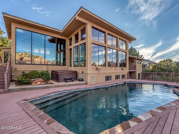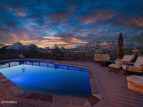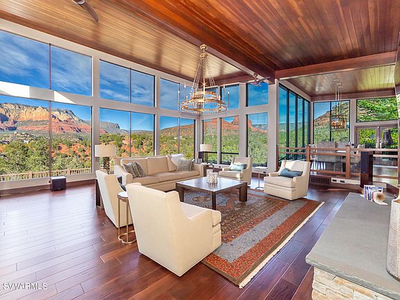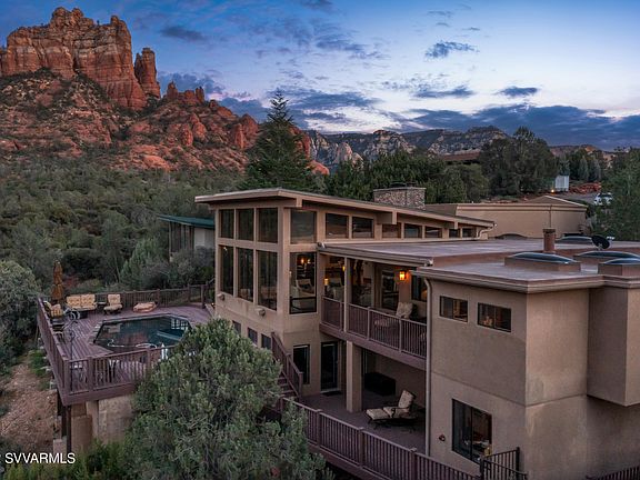 This one tops them all. Perched high on top of a bluff with panoramic red rock views sits the pinnacle of luxury homes. Extensively remodeled with top-of-the-line materials inside and out, you'll find uncompromising details like acacia hardwood floors, Viking and Thermador appliances, granite countertops, spacious California Closets, three fireplaces and 6 skylights bathing rooms with natural light. Soaring 15' ceilings frame jaw-dropping views of Snoopy Rock, Steamboat and Thunder Mountain. Take them in from the 8-person hot tub and heated swimming pool or multiple entertaining and seating areas on the newer tiered Trex decks. Peaceful and private yet walking distance to Tlaquepaque, galleries, restaurants, and hiking. An artist's studio and spacious lower-level in-law suite. Garage includes an electric charging station. Currently one of Sedona's most desirable and successful short-term rentals with rates from $819 - $2729/night. Most furnishings and artwork are available on a separate bill of sale.