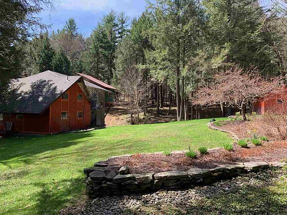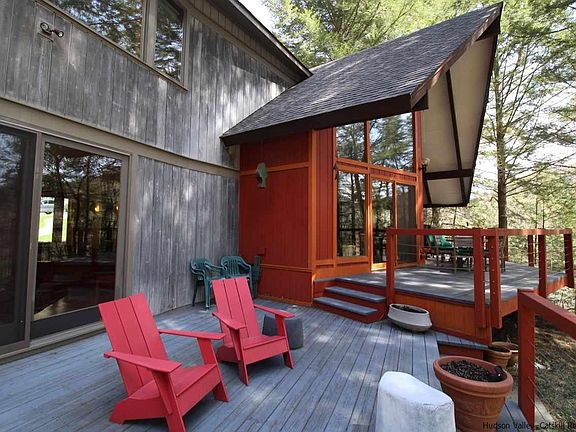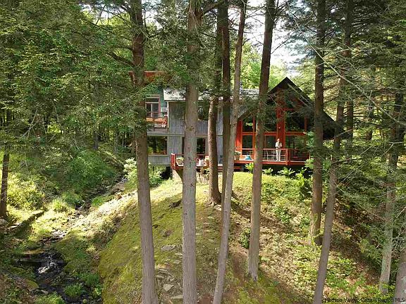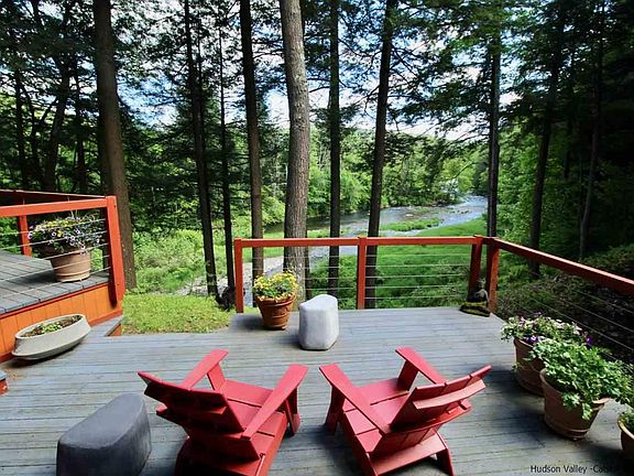 The original owner spied the land overlooking a long stretch of the Beaverkill River from the air, and decided he would build his home on that promontory. He cut in the road, which is now a town maintained road, and these two lots are at its end. Built in the '70s, a substantial addition was built by the current owners in 2006. A gracious entrance foyer connects the original portion of the house at left, with steps down toward the dining and kitchen area straight-ahead and the master wing upstairs at right. The Great Room's soaring ceiling and wall of glass highlights the exceptional river views that are evident from so many parts of the house. There is a brick fireplace, and sliding doors lead out to a stretch of deck tucked under the tall pines. Stairs within the Great Room lead up to the deep loft, which currently serves as a TV room, but which would make an ideal fourth bedroom, as there is a full bathroom with tub/shower up in this area. Off the living room is one guest bedroom, and off the entrance foyer is a second, both of which share a connected bathroom with shower. Then to the new portion of the house, which features cherry floors, starting with the kitchen and dining area, where the big feature is the river as viewed through glass sliders and picture windows. Cherry wood accents abound, particularly in the kitchen where cherry cabinetry and stainless appliances, including Viking stove, create a luxe chef's kitchen. Past the built-in bookcases and closets off the foyer and upstairs, the master suite again maximizes the views via picture windows and sliders out to one of a number of terraced decks. The master bathroom has soapstone counters, a soaking tub and glass enclosed shower. The office next door, up a few steps to its own level, is bathed in natural light and has its own deck. The house itself sits on a lot that is 8+ acres. There is a detached one car garage, and from the moment you arrive, you are aware of the soothing sounds emanating from the creek cascading out of the woods and over a waterfall within view of the front door. From there it tumbles down into the river proper. The multi-tiered decks start on the left side of the house and wrap around along the back, offering varying vantage points from which to take in the vistas and changing light over the Beaverkill. The property extends another 52 acres, encompassing a lovely swathe of mostly wooded, gently sloping lands. The trees are largely deciduous and make for pleasant woodland walks along some of the pretty trails. A clearing with a pond, ringed by colorful iris in springtime, is a short walk from the house.