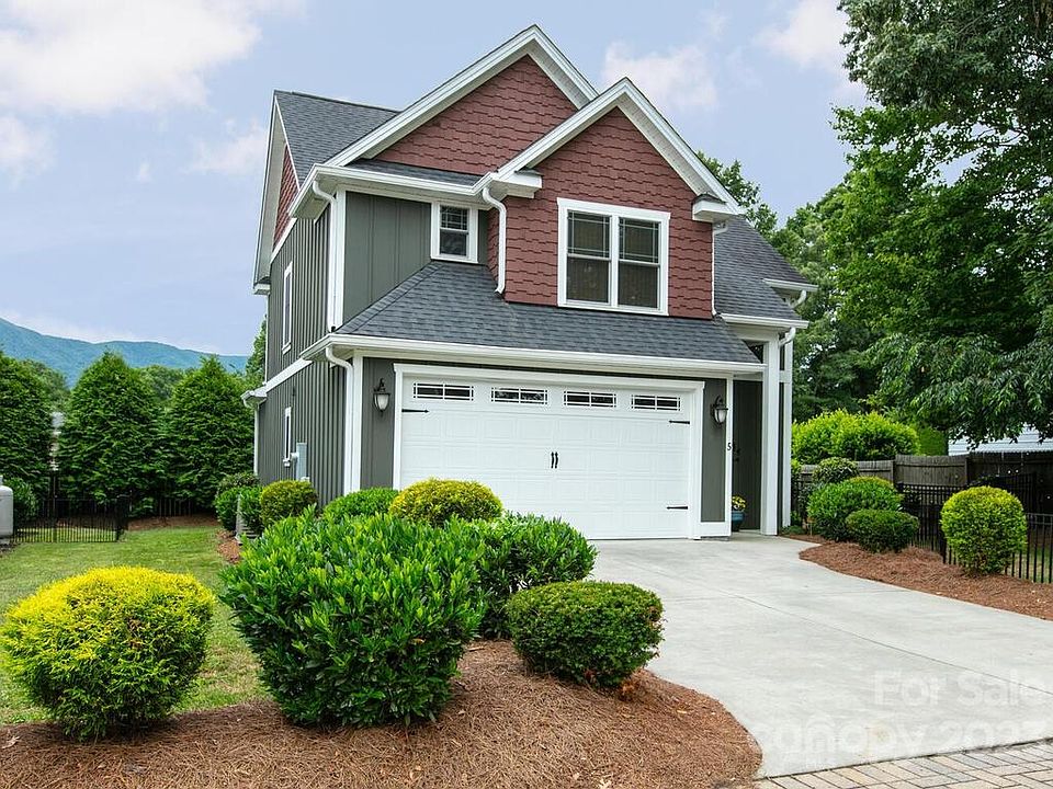 Gorgeous 2-story home w/ 3 bedrooms, 2.5 baths, beautifully landscaped yard, & AMAZING VIEWS! The main floor touts a fantastic open floor plan w/ tremendous space, hardwood flooring, & an abundance of natural light. The living room boasts a stunning floor-to-ceiling stone fireplace & access to back deck. The open kitchen will delight the family chef w/ stainless steel appliances, kitchen island w/ breakfast bar, tile backsplash, & tasteful design. The spacious primary bedroom suite has a walk-in-closet through the attached bathroom w/ double vanities & tile shower. 2 more well-kept, sizable bedrooms share another full bath, also w/ double vanities. You'll appreciate this home's fine features inside & out! Highlights include fenced level yard, attached 2-car garage, & huge patio area ideal for entertaining or simply enjoying the outdoors. Coveted location just around the corner from Black Mountain shops, restaurants, & charm! Only 20 mins to downtown Asheville. STRs allowed!