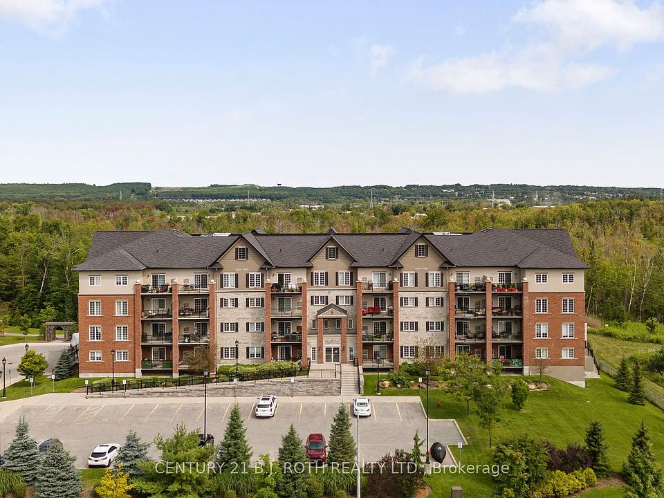 Embrace treetop serenity in one of Barrie's most picturesque communities. Set within the Ardagh Bluffs and wrapped by the natural beauty of Bear Creek Eco-Park, Greenwich Village is prized for its calm setting, walkable green space, and well-kept buildings. Suite 304 delivers that coveted "bungalow feel without the maintenance" and a rare, unobstructed eco-park view from every window and the oversized covered balcony, and yes, barbecues are permitted! Offering approximately 1,101 sq. ft., this bright, open-concept layout features two generous bedrooms, two full baths, and a seamless living/dining space that extends outdoors for effortless entertaining. Thoughtful interior upgrades include 9' ceilings that enhance the airy feel, high-end laminate flooring throughout, a custom built fireplace feature wall, and a well-appointed kitchen with modern slab-style cabinetry, Quartz counters, tile backsplash, under-mount double sink, stainless steel appliances (waterline to fridge), and upgraded plumbing fixtures. A compact water softener and in-suite laundry adds day-to-day comfort. The light, neutral bathrooms keep the palette fresh and timeless. Your private primary retreat offers a large walk-in closet and spacious ensuite. The second bedroom is ideal for guests, family, or a dedicated home office with a view. 1 Surface parking and 1 Underground parking with storage locker are included, practical must-haves for year-round living. Being on the third floor positions you level with the canopy, creating a peaceful, elevated outlook that changes beautifully with the seasons. Suite 304 is a hidden gem in one of Barrie's most desirable low-maintenance communities.