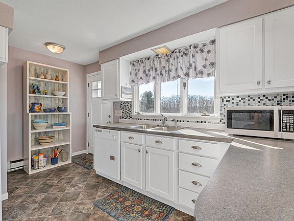 Beautiful views abound from all sides, inside and out, of this much-loved executive ranch home. The abundant windows throughout the house flood its ample living areas with light and create an airy, open feel. A newly refurbished kitchen, bright and crisp, opens up to a front-to-back living/dining area centered on a massive brick fireplace with a woodstove for extra cozy winter days. Three walls of this area feature picture windows and a slider to the new deck, revealing the property's large fields complete with a stone wall. Perfect for entertaining, the floor plan allows an indoor-outdoor flow with room for plenty of family and guests. Glowing river-oak laminate floors throughout the house tie the front space to a generous primary bedroom with its own updated bath. A second bedroom opens to both a second refurbished bath with huge shower and stacked washer/dryer (which stays), and to a screened porch that is perfect for pets and people. The third bedroom is an ideal space for guests or that peaceful work-from-home location. After work, the hot-tub awaits you just outside the kitchen door. The huge, unfinished basement has the beginnings of a perfect family room and includes a fieldstone fireplace. For those projects requiring a little more space, the garage has a convenient workshop, and opens into a breezeway that could serve as anything from a home gym to a cool place to relax in the summer breeze. Just minutes to Exits 19 and 20 off I93.