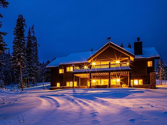 Located in the Diamond Hitch neighborhood of Moonlight Basin, this ski-in ski-out home at Big Sky Resort offers exceptional ski-out access with a groomed trail adjacent to the home leading to the Explorer Gondola and Pony lift. You can also walk a short distance to Challenger and be among the first on the upper mountain for powder turns, with ski-in return from much of Lone Peak. Set on 1.375 acres among mature pines with Spanish Peaks views, the setting feels distinctly mountain and wonderfully private. Inside, the vaulted great room features exposed timber beams, a tongue-and-groove wood ceiling, hardwood floors, oversized windows, and a stone-surround wood-burning fireplace. Numerous updates include a water filtration system and an updated kitchen designed for après and entertaining with Viking appliances, a generous center island, and a pantry, flowing into the dining area for easy hosting. The main-level primary suite includes deck access and a spacious bath. Step outside to a large deck, covered patio, and hot tub for year-round outdoor living in a true mountain setting. Sold furnished. Optional membership, upon approval, to Moonlight Basin provides access to additional amenities and services.