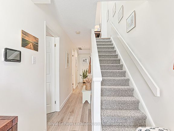 Wait no longer. Experience refined living in this beautifully appointed 3-bedroom, 3-bathroom end-unit condo townhouse, perfectly situated just steps from the marina and moments from the heart of downtown Collingwood. Designed for comfort and elegance, each spacious bedroom boasts its own private en-suite bathroom ideal for hosting guests or creating personal retreats for the whole family. This light-filled end unit offers enhanced privacy and exceptional natural light throughout, featuring the open-concept main living/dining area with a wood fireplace, cathedral ceilings, stainless steel appliances, oversized island with granite countertops and undermount sink. Walk out to a sun-drenched private, balcony perfect for morning coffee or evening entertaining, or enjoy direct access to the lower level patio and green space. Tastefully finished with quality materials, this home is move-in ready and designed for low-maintenance, four-season enjoyment. Located just minutes from world-class skiing at Blue Mountain, waterfront trails, golf, and Collingwood's vibrant shops and dining this is a rare opportunity to enjoy luxurious, carefree living in one of the areas most desirable communities. Ready for ski season! Low monthly condo fee $544