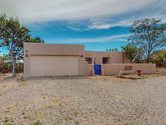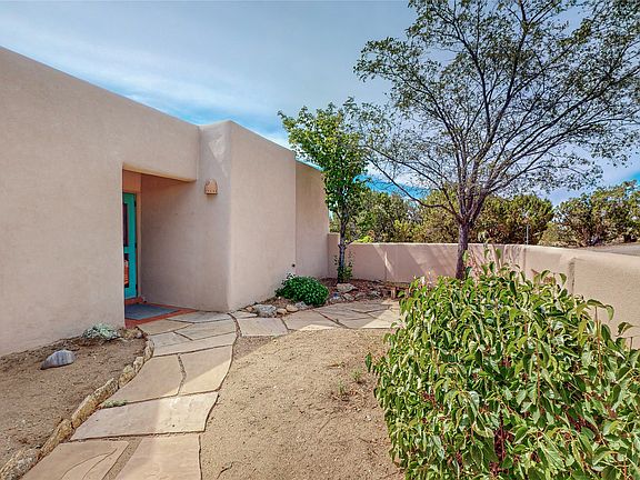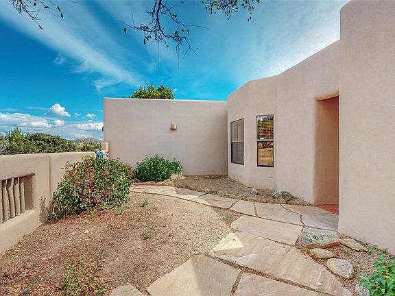 A rare exceptionally semi-private location with no thru streets and minimal ambient noise. Lot backs to a large greenbelt with direct access to social paths and the rail trail. East side of lot borders a retired historic railroad spur that runs between the Santa Fe Railyard and Lamy. The spur and subsequent train cars are occasionally used for slow-roll excursions and Hollywood movie sets (Oppenheimer). The east side of the home also features a flagstone patio with lovely views. The quaint home offers a super bright and light open flow passive solar design with high ceilings adding to spacious feel. Flexible floor plan. Great separation between owner’s suite and the 2 guest bedrooms. Livingroom with corner kiva fireplace can be converted back to gas. Freshly painted throughout the interior; the canales, stucco and overhangs newly maintained. All appliances are newer, along with chef sink. New lighting in kitchen, foyer, & bathrooms.