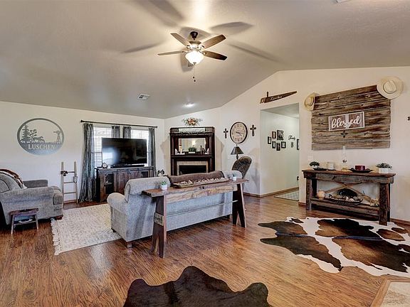 If outdoor entertaining is what you're into this property is for you!!! Nestled just outside Shawnee this home features a gorgeous outdoor kitchen complete with a pizza oven. Sit poolside with your coffee or cocktail in the backyard oasis! You can't forget the shop... it has a covered patio with fans and is trimmed with beautiful stained wood. The shop also has an area on the back to store an RV or lawn equipment. Now, take a look at the interior of the home. The open floor plan features include granite countertops, laminate engineered wood and tile in kitchen and common areas, and new carpet in the bedrooms. The kitchen has lots of counter space with an island/bar combo with extra cabinet space underneath. The fireplace provides comfort and warmth in the cold Oklahoma winters, and is aesthetically pleasing.The main bedroom has a large closet and ensuite bathroom with double vanity, sunken jetted tub, and separate shower. This home as too many amenities to list! Come see it for yourself! You won't be disappointed!