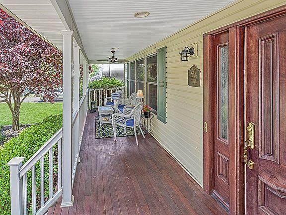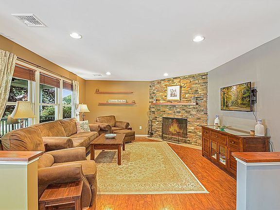 Gorgeous custom Colonial home was built with care by the owner. Relax and enjoy the spacious front porch welcoming you into this Living Room featuring a stone fireplace, large bay window and HW floors. Generous sized Formal Dining Room with 2-sided gas fireplace. Kitchen with 90* window view of the waterfall, SS appliances, granite, see through gas fireplace makes this kitchen a standout room for entertaining or everyday living. Upstairs boasts 4 large bedrooms with ample closets and storage space. Laundry room and remodeled bath located on this floor for convenience. Master en-suite includes soaking tub and stall shower. Additional 700 sq ft finished walk out basement with high ceilings feature a theatre room with 5.1 surround sound and projector, full bath, kitchenette, office and storage. Pavers and hot tub.