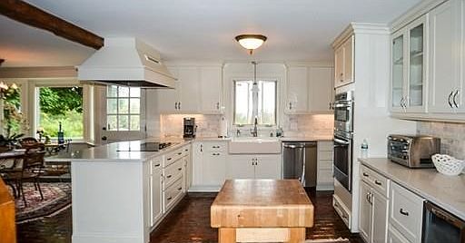 - Kit Dscrp: Main Level, Flooring - Wood, Dining Area, Countertops - Stone/Granite/Solid, Deck - Exterior, Flooring - Stone/Ceramic Tile, Breakfast Bar / Nook, Closet/Cabinets - Custom Built, Stainless Steel Appliances, Fireplace, Closet, Open Floor Plan, Recessed Lighting, Ceiling - Beamed, Countertops - Upgraded, Remodeled, Wood / Coal / Pellet Stove, Window(s) - Bay/Bow/Box, Country Kitchen, Wine Chiller, Peninsula