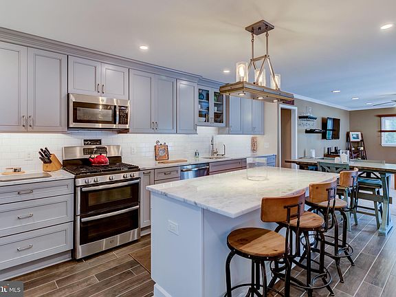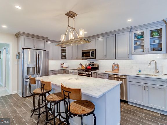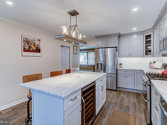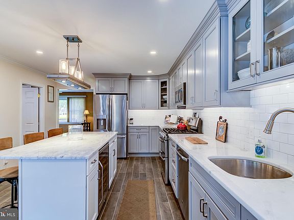 Pride of ownership abounds in this well-maintained and updated 4-BR 2-BA ranch home situated on a wooded and fenced private lot just minutes to commuter routes and shopping! Step into an open floor plan with spacious living room featuring bright sunny windows, neutral paint and new carpet (over hardwood) with easy flow to the kitchen and family room areas. The 3-year young chef’s kitchen is stunning and was remodeled with 42” Kraftmaid custom soft-close cabinetry in a neutral light grey, crisp white subway tile backsplash, gorgeous Quartzite counter tops, recessed sink with custom faucet, stainless steel appliances including French door refrigerator with ice service and bottom drawer freezer, dishwasher, 5-burner gas range with double oven, wine refrigerator, and built in microwave. The huge kitchen island has plenty of storage and seating, perfect for entertaining. The beautiful wood look tile floor makes a bold style statement. A spacious family room right off of the kitchen is perfect for watching the big game and hosting friends and family, with deck access through sliding doors. The primary bedroom has new carpet over hardwood, sunny windows, ceiling fan, and a generous closet with updated bathroom vanity and tile floor. The 2nd bedroom has new carpet over hardwood. A 3rd bedroom has hardwood floors and is currently being used as a home office. The 4th bedroom would be a perfect in-law or guest suite on the other side of the home with hardwood floors and hall bathroom access, with stall shower. The laundry center is conveniently located in the mud/utility room. The 1-car garage has indoor access from your private driveway. Sip your coffee in the morning or relax at the end of your day on your huge composite deck with retractable awning overlooking the serene fenced and wooded backyard. Other updates include new HVAC 2018, younger roof (approx. 2010), some newer replacement windows. This home has been updated beautifully and offers so much more than other homes its size. So much value in this home!