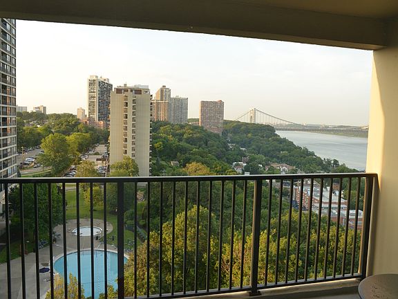 Studio style in a co-op. North views of the Hudson from the balcony space and of the George Washington Bridge. There is a large laundry room in the basement. Doorman building with dedicated parking space. The grounds have two pools and a gym in each of the six buildings for Horizon Houses along with a Deli underneath building 6. The NJ Transit bus stops right outside of the grounds and the bridge is a mile walk north. There are application fees the building requires totaling $715.00 and I will reimburse you $300 if you are approved by the board and sign to move in. A breakdown is below: - $600 Application fee - $50 Credit Check Fee - $65 Processing fee I am listing as the owner - no agent fees. The lease is 1 year and can be renewed each year. Rent would be $1850/month and that includes everything! (Wifi/Cable/Electric/Hydro/Parking/Gym). No pets in the unit. (Sorry! Building policy for this unit). All utility fees are included in the rent.