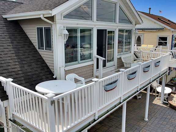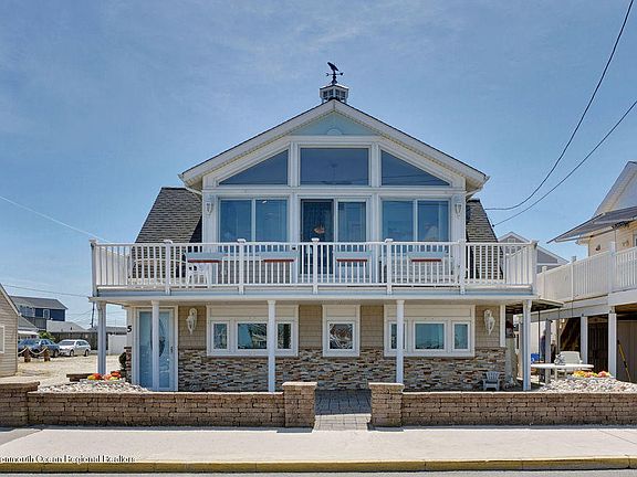 Rare opportunity, one of a kind, beautiful custom contemporary 3 BR 2 BTH home, 1/2 block from beach with fantastic, breathtaking views of the ocean and Manasquan Inlet. Fishing the Inlet at your door step. First floor has 2 BR, LR/DR, kitchen, bath, with Jacuzzi tub, W/D, tile floors. Second floor has private interior entry guest quarters featuring 1 BR, LR/DR with custom stone fireplace, L shaped stone counter with wet bar sink and separate breakfast table, vaulted ceilings, hardwood floors, floor to ceiling windows and patio door that steps onto 30' deck. Home has high quality cabinets, stone counters, backsplash, ceiling fans throughout. Everything new including furniture, appliances and AC's. Large custom paver front yard for outdoor entertaining and ample parking.