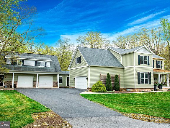 This one-of-a-kind home is located just minutes away from the heart of Bel Air. Offering a two-story guest retreat/in-law quarters, complete with a separate entrance for privacy and comfort. There’s plenty of space with six bedrooms and the potential for eight. A covered front porch with a distinctive copper roof welcomes you. Inside, the main house offers hardwood floors on two levels, wood stairs with decorative runners, faux wood blinds and recessed lighting. Throughout the home is a unique blend of farmhouse and craftsman-inspired interior design elements including board and batten, sliding barn doors, solid wood 3 panel doors, shiplap, wood shelving, straight edge baseboard and trim. Upon entry, the foyer opens to a spacious living room featuring a pellet stove (10/2021) framed with a mantle, brick, shiplap and decorative tile. Off the living room, a large, light-filled formal dining room is perfect for large gatherings. The well-appointed kitchen offers beauty and function with a center-island with butcher block top (2024), granite counters, subway tile backsplash, wood exhaust hood, slate appliances (refrigerator 2024 & dishwasher 12/2023), wood shelves, two-tone cabinetry with base trim and crown molding, and updated bronze hardware (2024). The centerpiece of the kitchen is the hammered copper farmhouse sink, adding both charm and character. An informal dining space with double doors to the backyard is the perfect setting for your morning coffee. Off the kitchen, is a convenient main level laundry/mudroom with a framed glass interior door, galvanized utility sink, and herringbone tile floor. This also serves as entry from both the side-load garage and attached breezeway. A convenient main level half bathroom features a white vessel-style sink on a wood vanity with a wall mounted faucet. The upper level offers an elegant primary bedroom with an accent wall, walk-in closet, and ensuite featuring a free-standing tub (2024), tile floor, double vanities, and shower with both subway and penny tile. Two additional bedrooms are good-sized and share a full bathroom with double vanities. At the end of the hallway is a large unfinished attic space for additional storage or a potential bedroom. The lower level offers a vintage entry door, 9-foot ceiling, built-in bookshelves, wood wrapped beam, bathroom rough-in, windows, space for additional rooms, and walk-out stairs. The enclosed breezeway connects the main house to a second spacious garage with internal access to the guest retreat/in-law quarters. The main level of the guest retreat offers a foyer, half bathroom, and a bedroom which could also serve as an office, studio or den. Stairs lead to an open concept living, dining and kitchen area with a center-island, granite tile counters, vinyl wood floors, backsplash, board and batten trim, and stainless appliances (stove recently updated). Off the living space is a laundry closet, two additional good-sized bedrooms each with a walk-in closet, and a full bathroom with tile, pendant lights, and double vanities with a decorative tile backsplash. For outdoor living, this space offers a large deck with privacy panels, black metal rails, & stairs to a fenced back yard. Situated on a park-like lot with ample space for entertaining, relaxing, gardening & outdoor play. A wood frame has even been added to hold a screen for outdoor movie nights next to the fire pit. The exterior of the home boasts distinctive design elements, including two-tone siding with vertical accents, board and batten shutters, decorative wood panels, patio pavers, & stone trim. The two attached garages can accommodate a total of 4 cars, offering a generous 1,160 sq feet of space. The best part is there is no HOA! Convenient location is close to shopping, restaurants, parks, schools & downtown Bel Air. This is truly a one-of-a-kind home! Note: 2 new black 8’x14’ aluminum wire gates to be installed in yard, & center garage door is being replaced due to dent.