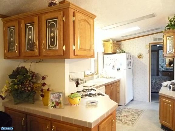 Very gently lived in, extremely well-maintained absolutely move-in ready this cream puff offers new carpet, new wood blinds, ceiling fans w/lights in both bedrooms living room, security system, covered deck outdoor storage shed. The kitchen offers an abundance of oak cabinets w/glass doors, counters w/tile-trimmed edge, double sink, GE Profile dishwasher GE range, new Hotpoint microwave, over cabinet lighting w/dimmer, chandelier over table w/dimmer, and a skylight. The spacious living room has a sliding door entry volume ceiling. The master en-suite offers a large double door closet French door entry into vanity area w/skylight, oak cabinetry w/glass doors, stall shower w/full fiberglass surround w/built-in seating and separate water closet. The 2nd bedroom is bright spacious w/double door closet decorative window. The interior has been freshly painted and is clean, clean, clean! Lot lease includes taxes, on-site management, trash, recycle, water, sewer, common area mowing plowing.