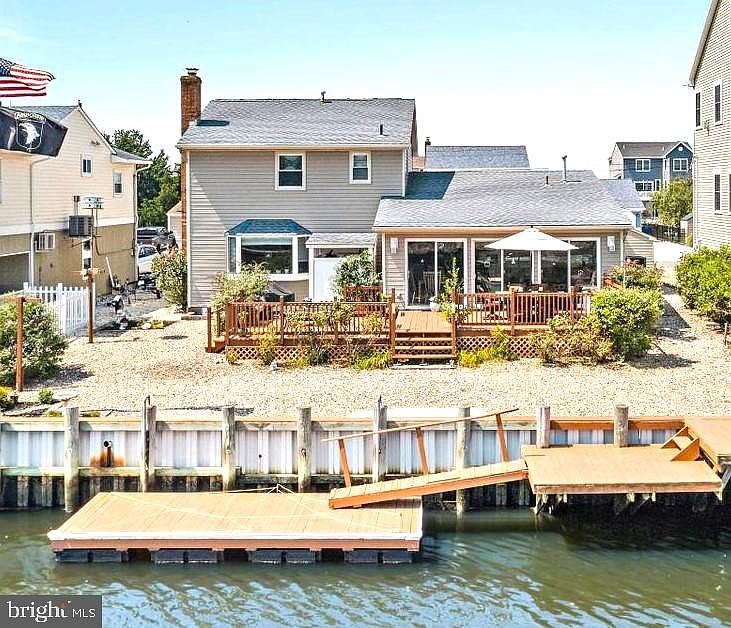 Beautiful Osborn Island Waterfront home with 4 bedrooms and 2 baths with an updated kitchen, lovely family room with a pretty brick, gas fireplace and a bay window and great views of the large backyard. The updated kitchen has lovely white cabinets, some with glass doors, plus newer stainless appliances, and a separate breakfast bar. There is a large bedroom on the ground floor and an updated full bath. The large dining room is large enough to be used as a living room instead with great light from large windows. The Sunroom is the showplace of the home, with lots of light and room for another eating area and sitting area. There are three Anderson sliders to the two-tiered deck and the large yard with 65 ft of vinyl bulkhead by Amon, with 2 cantilevered docks and a floater. Upstairs there are three more good sized bedrooms, and a full bath. There is a separate laundry area and a large mudroom too. The home has many closets, 2-zoned gas heat and central air, a newer roof, and solar panels, and is on a crawl space. This is on a deep lagoon, with easy access to mouth of Great Bay and a short ride to Holgate Inlet by boat. Fish, Swim, kayak, and jet ski and boat from your private backyard oasis. HIGH and DRY! The home had no water from Sandy and the flood insurance is very affordable. In a small, beautiful area of homes on larger waterfront sized lots than most of Mystic Islands. Great Bay beach is within walking distance and is a great area to swim and fish and catch the views of Atlantic City and has just been all re-done this year. The garage was converted to the downstairs master closet and large mud room.