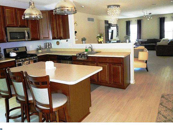 Beautifully appointed 3 story townhouse only 3 years young with a premium location backing to woods. The first level offers great flex space,with a full bath, could be family room, office space, guest room, and walks-out to the stamped concrete patio and fenced yard. The main level features upgraded eat-in kitchen with a 6 'island, 42"cherry cabinets, large pantry, stainless appliances and 12x12 deck. The inviting great room has lots of natural light, hardwood flooring, stunning upgraded lighting fixtures, gas fireplace and custom built-in cabinetry. The 3rd level offer 3 large bedrooms, laundry room, and upgraded hall bath. The master suite highlights vaulted ceiling, walk-in closet and upgraded private bath with oversized shower. Every room has large closet and overhead lighted fan. Conveniently located in the back of the community, adjacent additional parking and nearby major highways, shopping, Philadelphia and the Jersey shore.