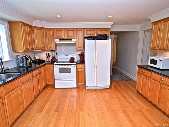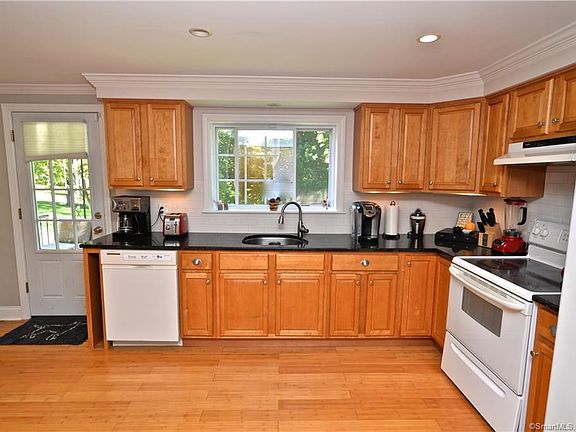 This modern and impressive ranch home, offering 3 spacious bedrooms and 2.5 baths, is majestically set on a corner acre lot in desirable Putney. The first home to welcome you to this beautiful, tree-lined cul-de-sac neighborhood, 5 Kings Row features a bright, open concept kitchen and dining room with granite counter tops, wet bar, wine refrigerator, and access to the covered back patio. Beautiful hardwood floors grace the main level of this home and the lower level (not heated) offers additional recreational space with fireplace, prep kitchen with wet bar, private office, laundry area, storage, and access to the 2 car garage. Only minutes away from the Merritt/I95, Stratford's best dining, Metro North, and endless shopping. Sale is subject to seller finding suitable housing.