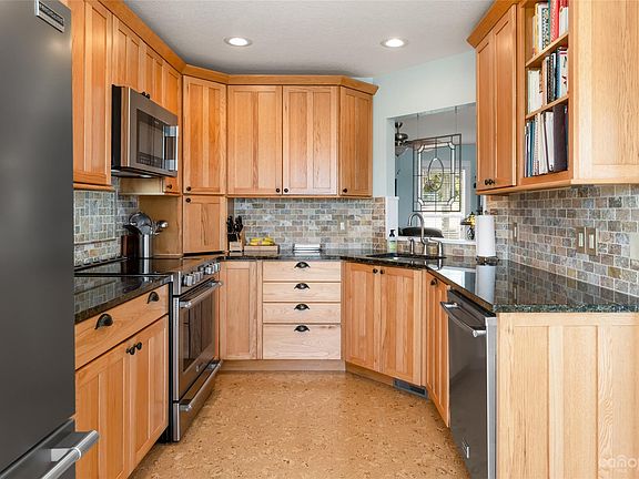 Remodeled kitchen with granite countertops and stainless steel appliances.